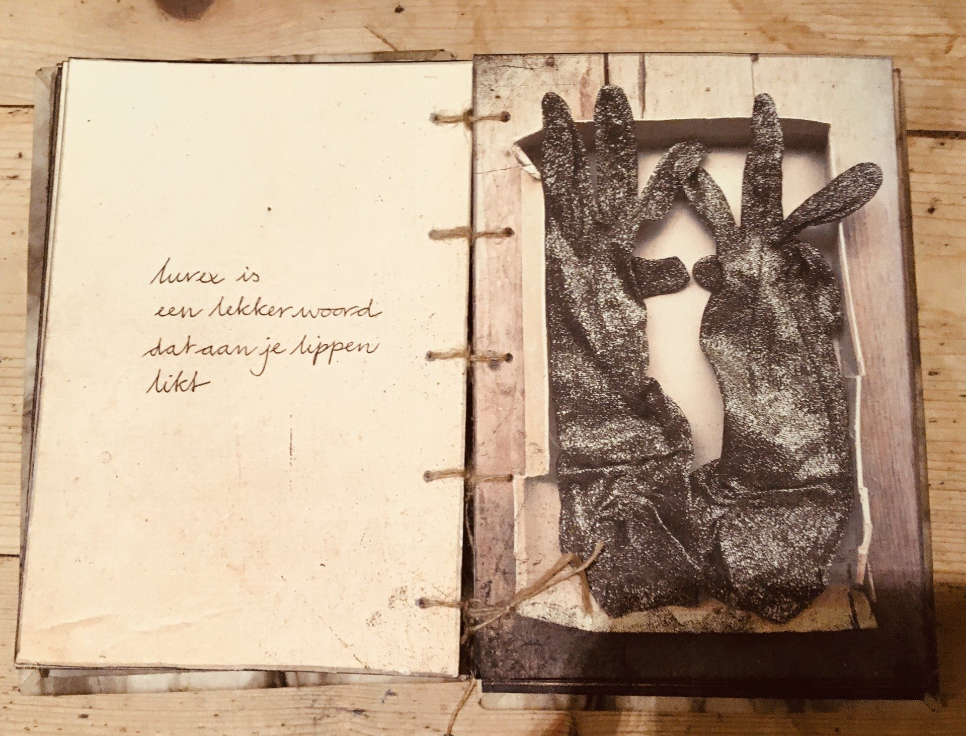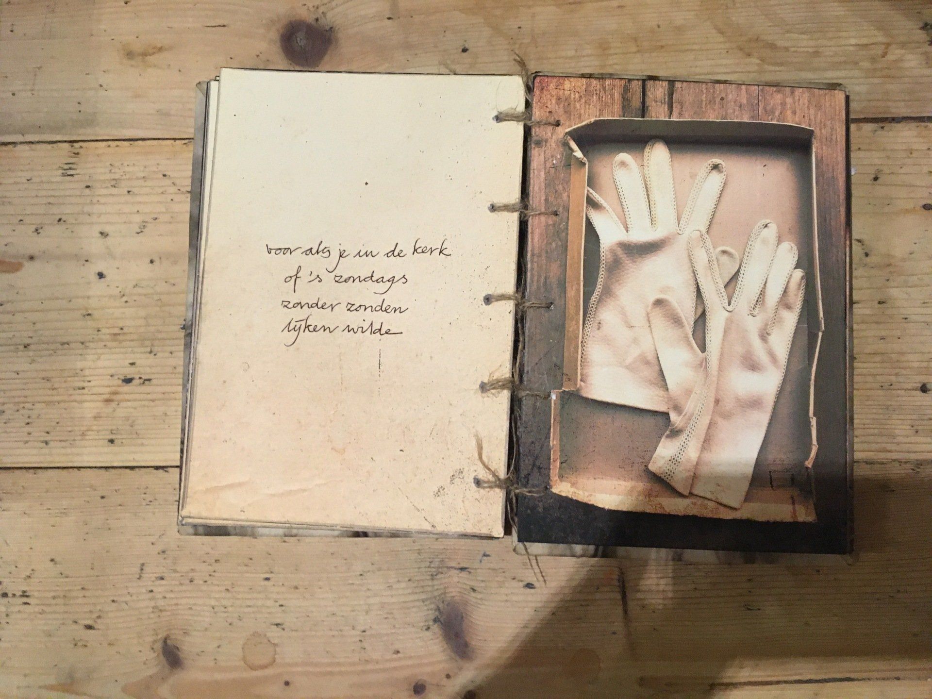 Een van de negen pagina's met tastbare herinneringen uit een lang bewaarde schoenendoos. Met tekst en een gedicht.
