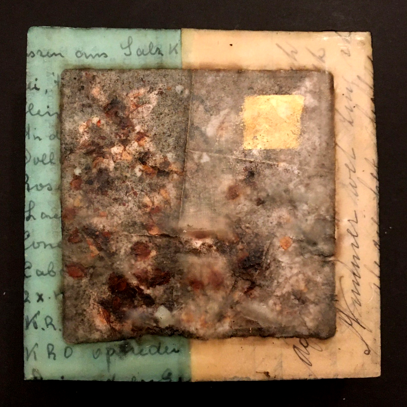 Serie mixed media collages van 10x10x2cm met wax en resin